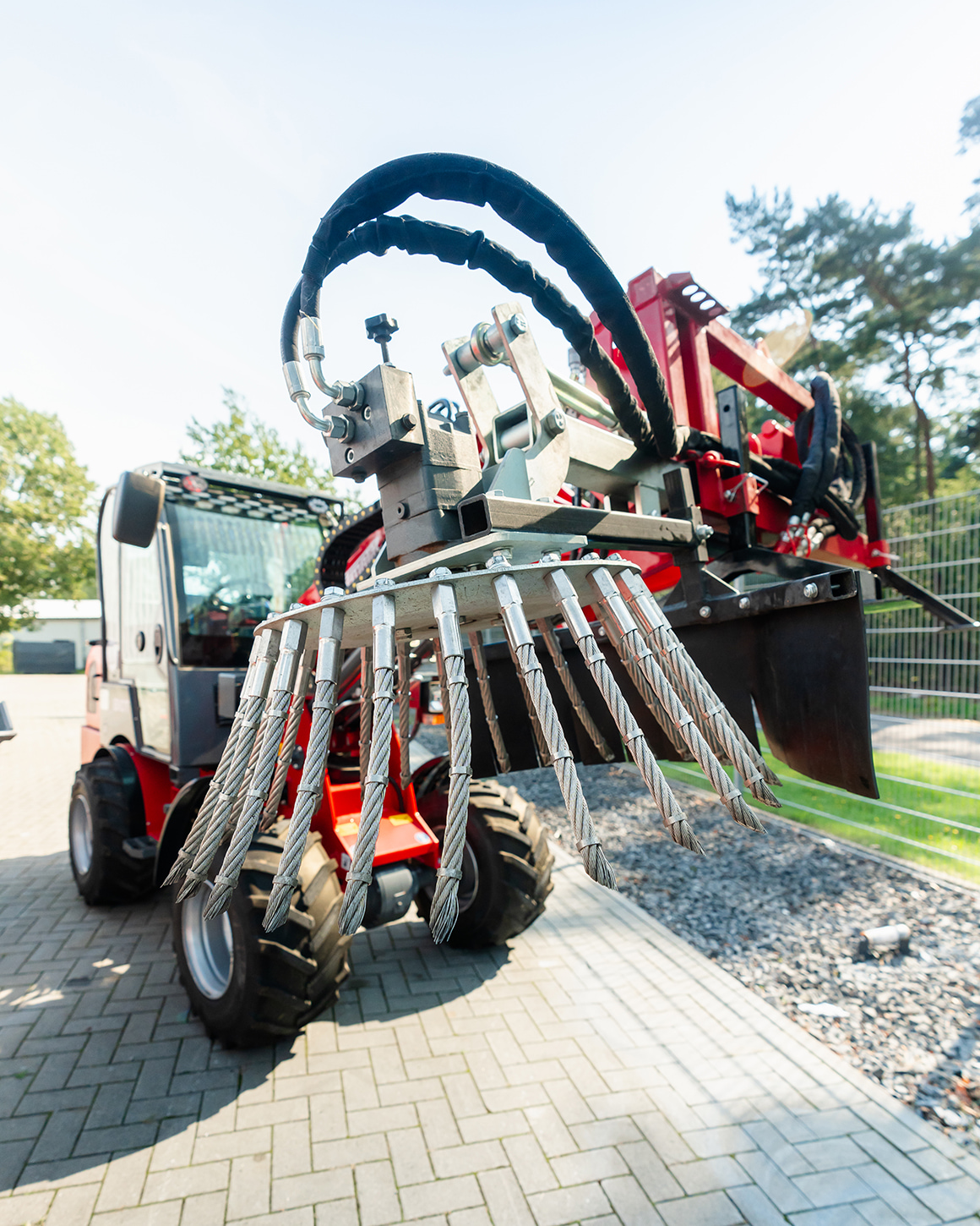 Der Teller der Bürste ist bestückt mit 25 einzelnen Drahtbürsten mit einem Durchmesser von je 16mm und hat eine Arbeitsbreite von 70 cm. Jede Bürste ist problemlos am Bürstenteller zu wechseln. So wird eine lange Lebensdauer gewährt. Eine integrierte, einstellbare Schutzmatte ist ebenfalls enthalten.
